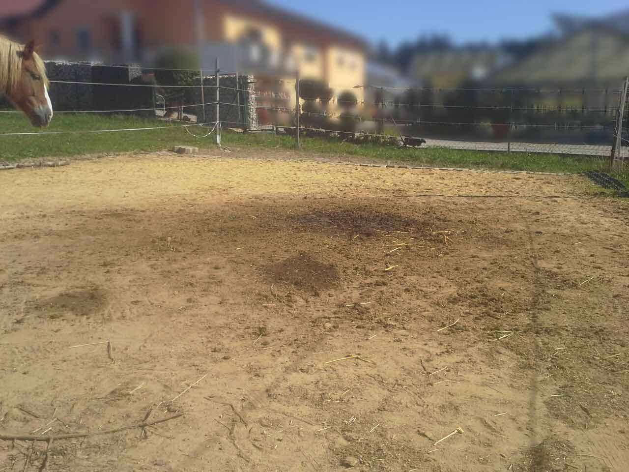 Das Abmisten und die Pflege des Paddocks sind sehr angenehm und leicht zu handhaben. Allerdings muss vor dem Winter nochmals eine Schicht Sand auf die Fläche von 150 qm, da durch das Abmisten und das Abtragen des Sandes durch Wind einiges an Sand verloren ging. So werden demnächst 12 bis 13 Tonnen Sand (0/4er Sand) aufgeschüttet. Dieser 0/4er Sand ist schwerer, d. h. er beinhaltet mehr gröbere Steinchen und hält sich somit bei Wind hoffentlich länger.