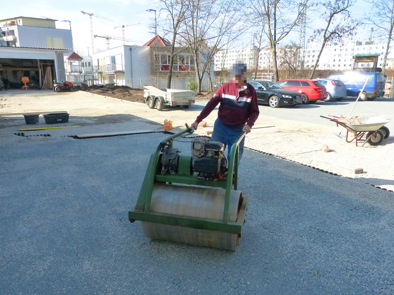 Zu Beginn wurden alle Randanschlüsse mit Beton um 5 cm erhöht und anschließend alle Übergänge an vorhandenen Ebenen erstellt werden. An einigen Übergängen muss zudem auch der Asphalt abgefräst werden. Sind diese anfänglichen Arbeiten erledigt, geht es an die sog. Nivellierung. Dazu werden Unebenheiten durch Abtragen entfernt oder befüllt, um so eine plane Fläche zu erhalten. Auf die so vorbereitete Fläche werden dann die Kiesmatten KM30 verlegt und untereinander verbunden bzw. gekoppelt und anschließend mit Schüttgut befüllt. Wir empfehlen an dieser Stelle die Kiesmatten mindestens 1–2 cm über die Oberkante zu überfüllen.