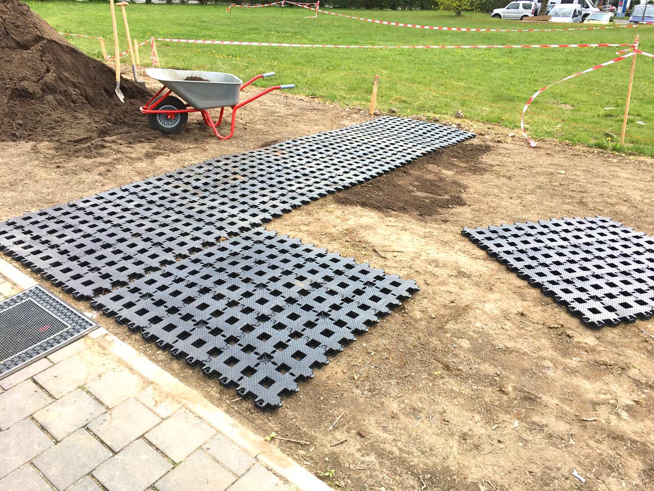 Der Unterschied im Vergleich zu herkömmlichen Rasengittern aus Kunststoff oder Rasengittersteinen aus ist, das schnelle und einfach3 Verlegen direkt auf den bestehenden Rasen. Aufwendige Erdarbeiten oder das kostspielige Herstellen eines Unterbaus entfallen. Wie in dieser Referenz schön zu sehen ist, wurde der Rasen weder nivelliert oder eingeebnet. Der Rasengitterstein passt sich, dank der integrierte "Gelenke"einfach den Unebenheiten an, sofern diese nicht zu groß sind.