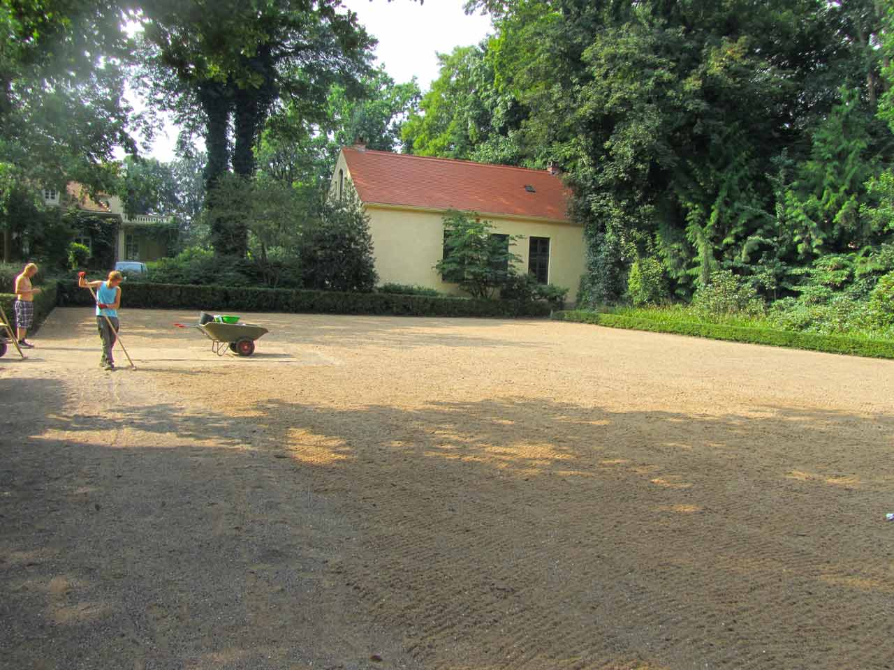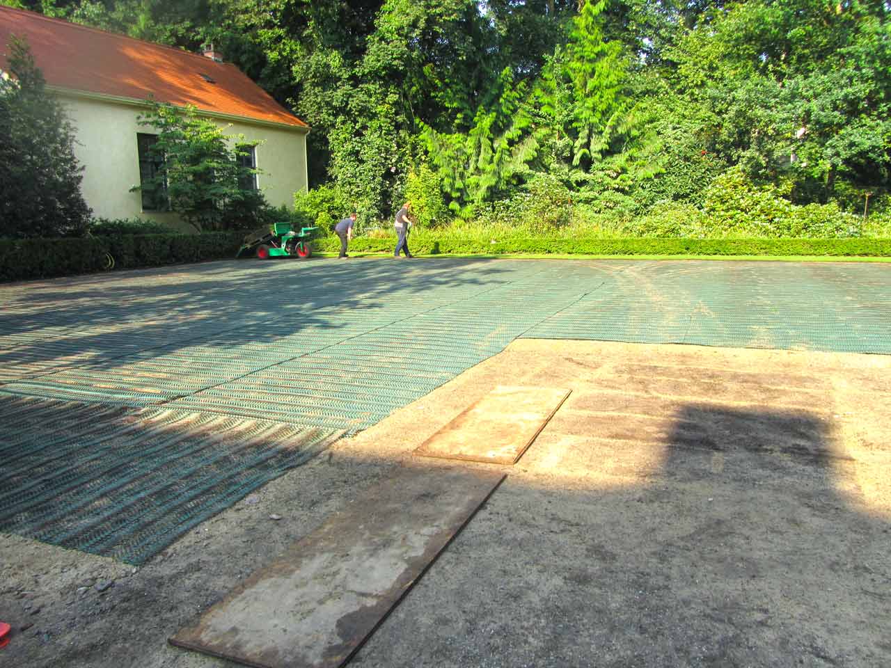 Im ersten Arbeitsschritt wurde die Grasnarbe abgezogen. Die so freigelegte Fläche wurde mittels einer Walze verdichtet und planiert. Anschließend wurde ein stabilisierendes und bewährendes Geotextil Trennvlies verlegt.